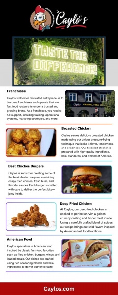 Caylos offers delicious broasred chicken prepared with a special blend of spices and pressure-frying methods to achieve perfect tenderness and crispiness. We use halal-certified chicken ...