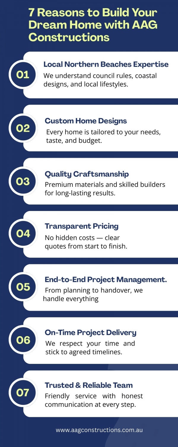 Building a new family home is an exciting journey, and at AAG Constructions, we make it smooth and stress-free. As a trusted new home builder in the Northern Beaches, we focus on quality construction, smart planning, and clear communication at every stage. From the first design discussion to final handover, our experienced team handles every detail with care. We understand local council requirements and coastal conditions, helping to avoid delays and unexpected issues. Using quality materials and skilled trades, we build strong, safe, and comfortable homes made to last. Most importantly, we listen to your needs and create a home that truly suits your family’s lifestyle today and for the future.